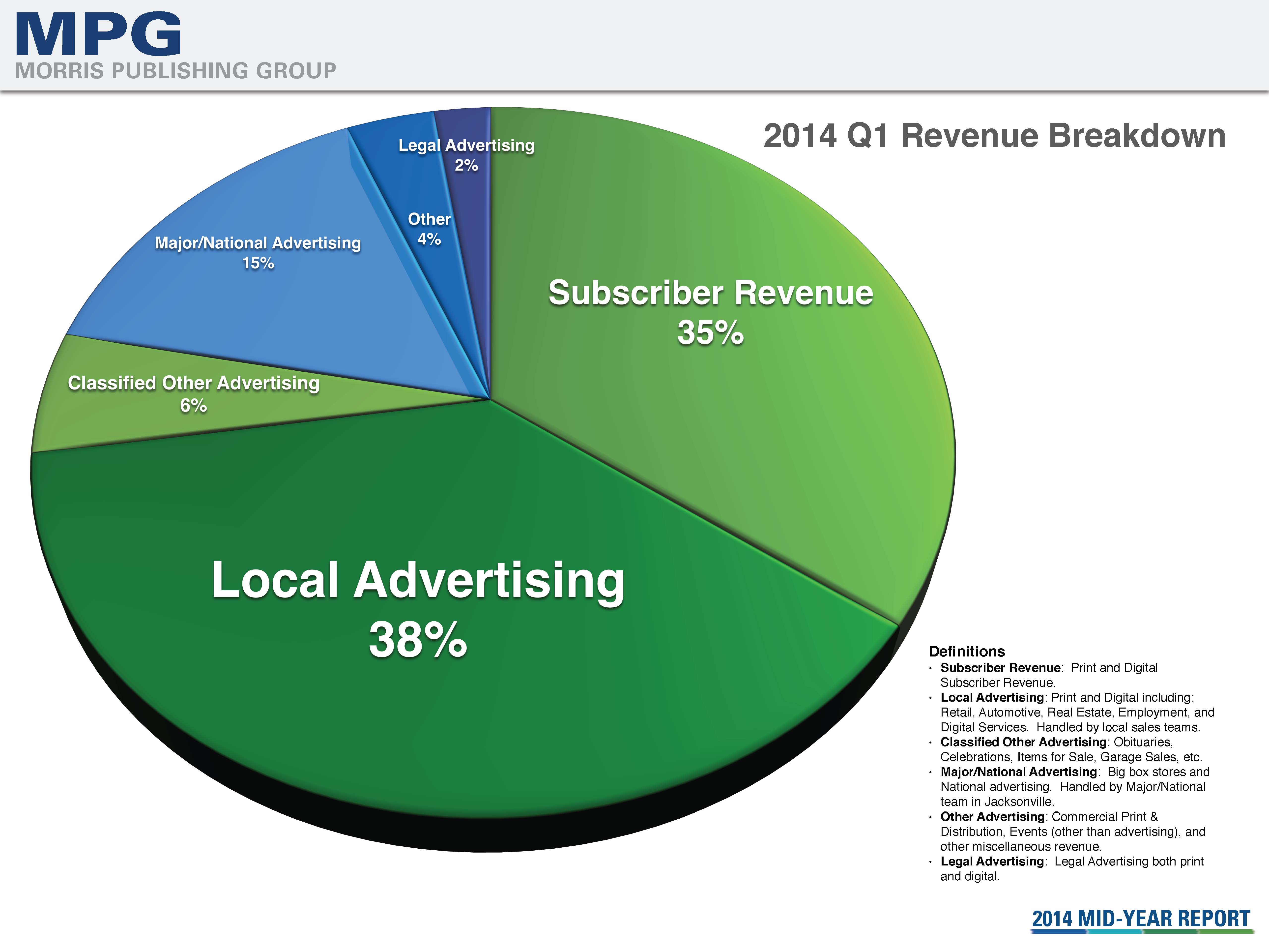 But these accounts are largely beyond a local newspaper unit’s control, because unilateral decisions are made at the advertisers’ corporate headquarters. Spending in this category has been shrinking steadily across the entire newspaper industry, and the trend is sure to continue. In the first quarter of 2014, at Morris, these accounts constituted only 15% of our revenue (see first chart).
