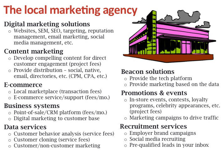 - Digital marketing solutions. These are the basic building blocks of a competent marketing and advertising program for any local business. More and more traditional media companies are now offering this cluster of services, often calling it a “digital agency” approach. Here and here, I wrote about this, and about how we went after it at Morris — although our model has changed a lot since then.